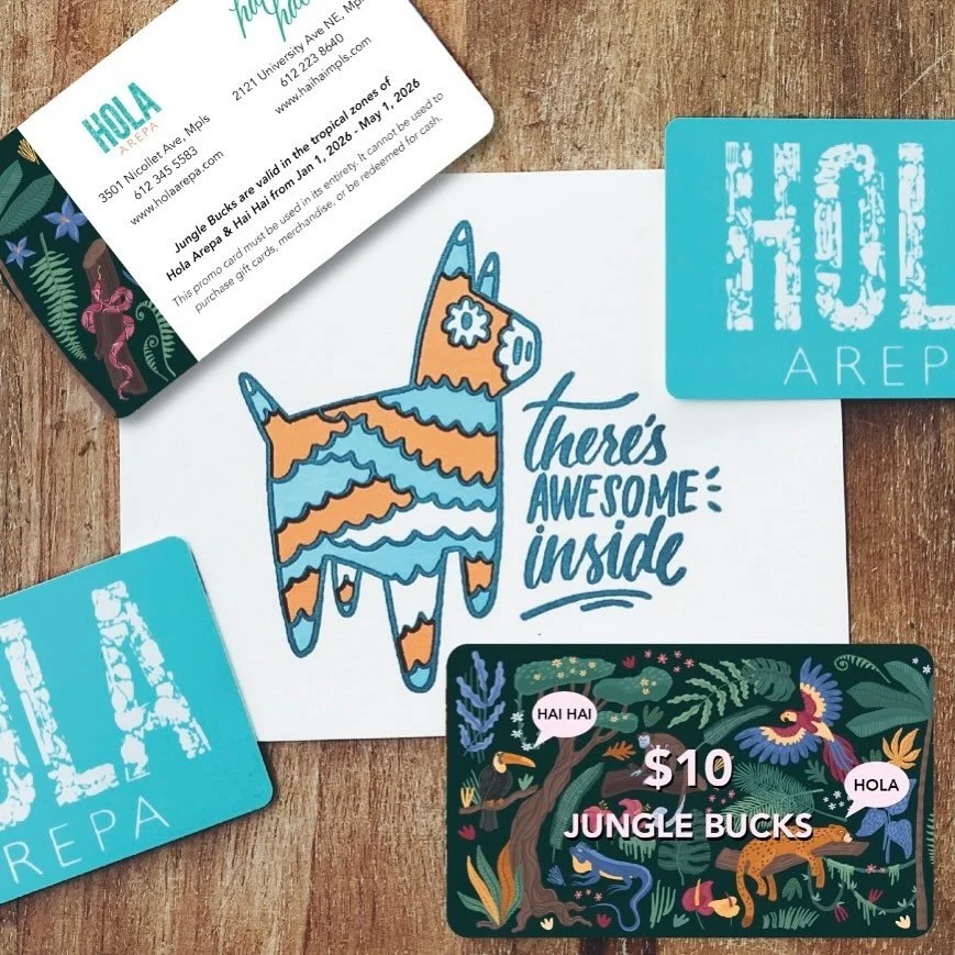 For every $50 you purchase in Gift Cards, you get $10 of Jungle Bucks to spend at Hola Arepa or Hai Hai between Jan 1 - May 1, 2026. (eg. Buy $100 of Gift Cards, get $20 of Jungle Bucks). Keep them for yourself or send them to a friend! Offer valid thru Jan 1, 2026.